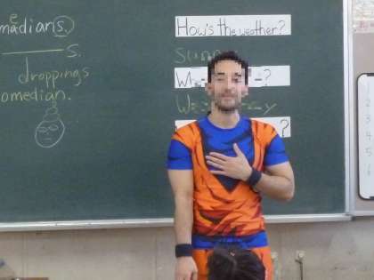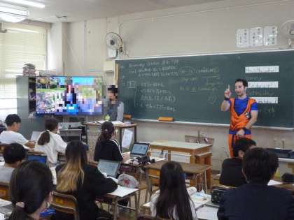 週末の10月31日(金)がハロウィンです。CーNETの先生が、子どもたちのために、ド○ゴンボールの衣装に仮装して授業してくれました。