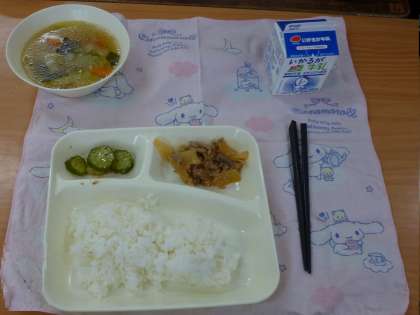 今日のこんだては、豚肉のコチジャンいため・鶏肉とはるさめのスープ・きゅうりのナムルです。豚肉のコチジャンいためは、甘辛い味つけでごはんとよく合っていました。