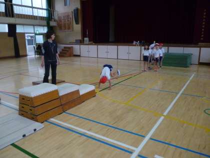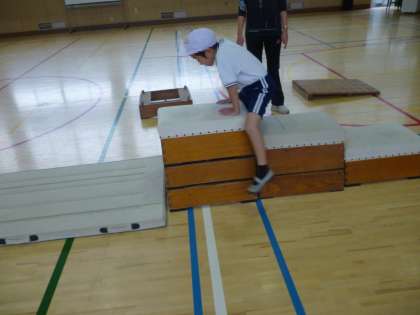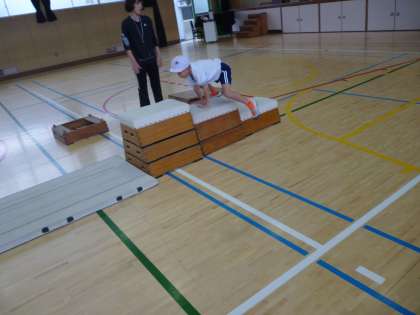 こんどはだんさをつけています。ゆかでうさぎとびをしてから、またぎのりです。