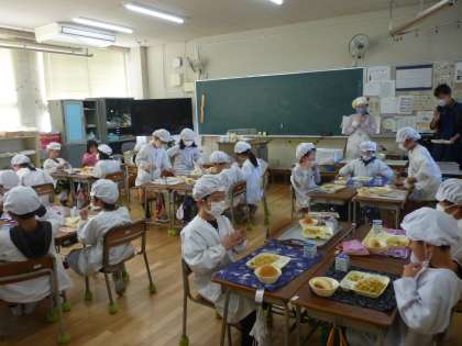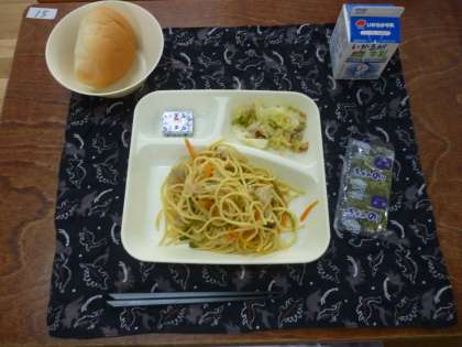 今日のこんだては、ウインナーときのこの和風スパゲッティ・焼きツナキャベツ・固形チーズです。和風スパゲッティは、子どもたちにも食べやすい味付けで、きざみのりをかけて食べると、よりいっそうおいしくなりました。