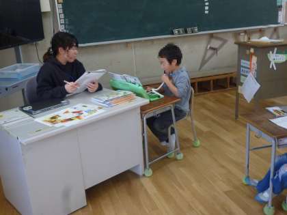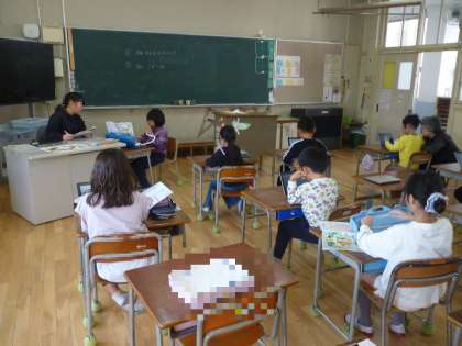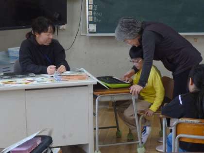 けんばんハーモニカのてんけんです。かえるのがっしょうとこぎつねをひいています。みんなしゅちゅうしてがんばっています。