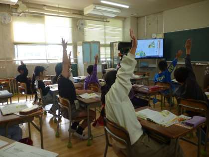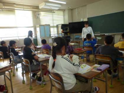2年の教室で道徳の授業研究会をしました。子どもたちは、たくさんの先生が見守る中、集中して学習しています。