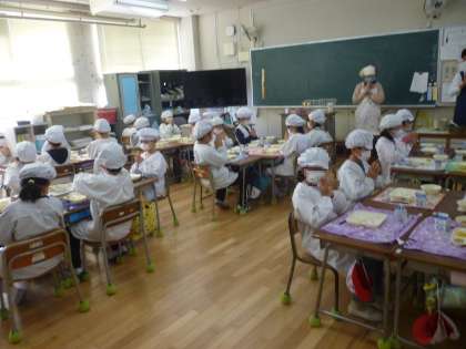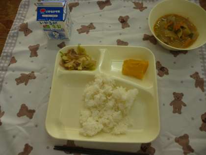 今日のこんだては、ぶたにくと野菜のいためもの・いわしのつみれ汁・かぼちゃのういろうです。いわしのつみれ汁は、具材のうまみがよく出ていておいしかったです。