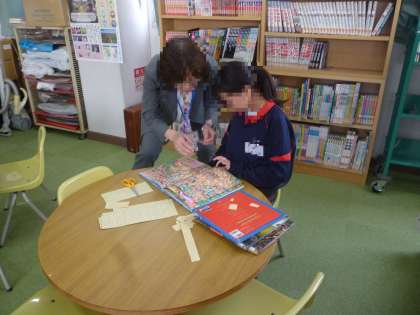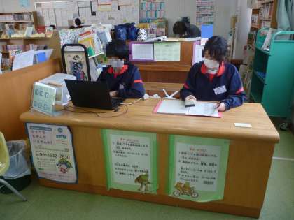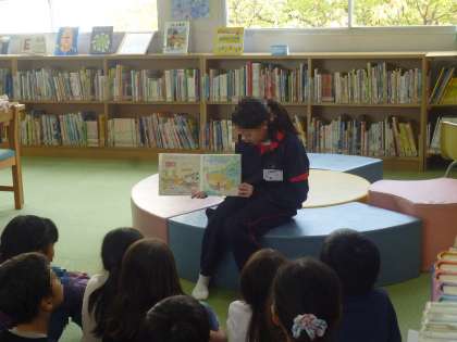 図書の時間に、受付や本の修繕をしています。2年生に読み聞かせもしてくれました。子どもたちはものがたりに聞き入っていました。