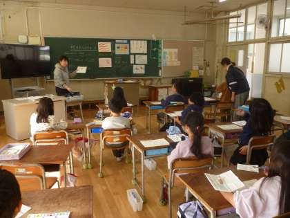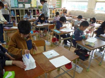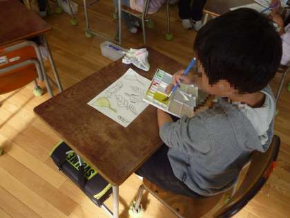 おちばをかき、えのぐで色をぬっています。水のりょうをちょうせつして、いい色が出ています。