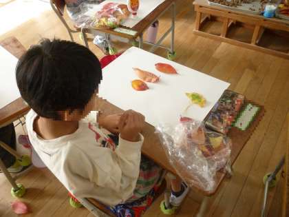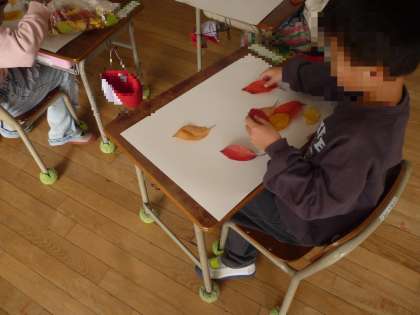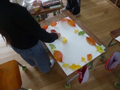 こうていで、おちばをみつけてきました。がようしにならべていきます。