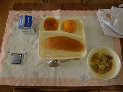 今日のこんだては、ぶたにくとやさいのスープに・かわりピザです。スープには、ぐのうまみがよくでていておいしかったです。