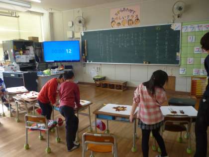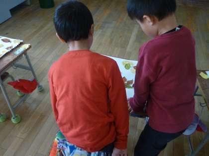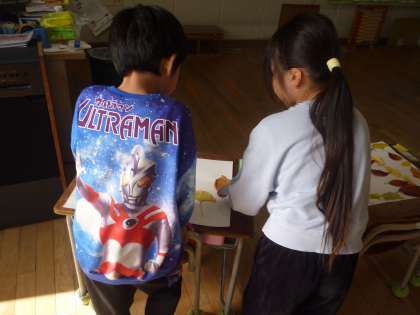 おちばでつくったさくひんを、なにに見えるか、ペアになってつたえあっています。