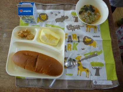 今日のこんだては、さけのマリネ・にくだんごとおしむぎのスープです。さけのマリネは、からっとあがったさけに、ほどよいさんみでたいへんおいしかったです。