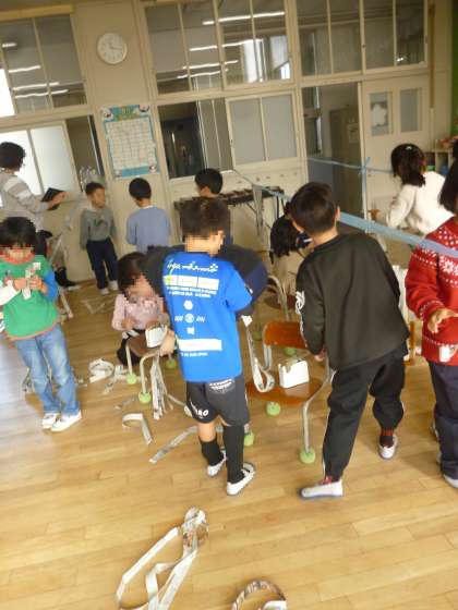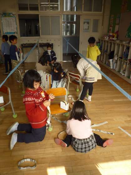 つぎに、ほそ長いかみをつるしていき、みんなできょうしつをジャングルにします。