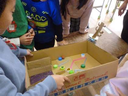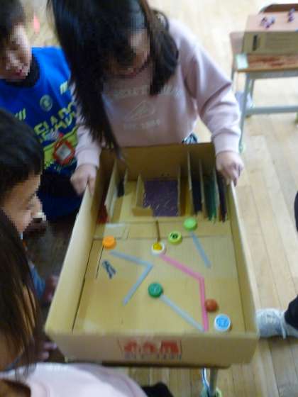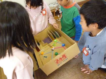 つぎのおもちゃは、コリントゲームです。どんぐりをころがしてたかいとくてんをめざします。