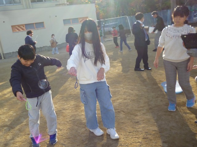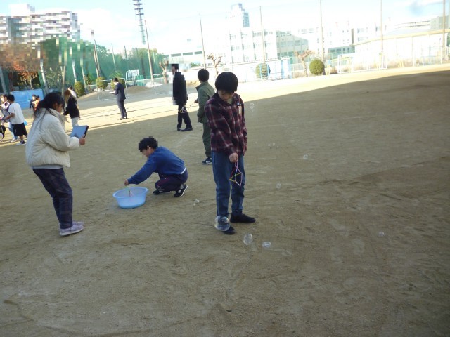 2学期最後のクラブ活動です。科学実験工作クラブの活動のようすです。シャボン玉づくりにチャレンジです。めあてを決め、班で活動します。シャボン玉液ができると、運動場でシャボン玉をとばしました。大きなシャボン玉もできました。次回は、色つきのシャボン玉をつくります。