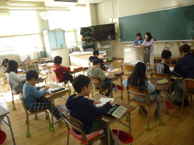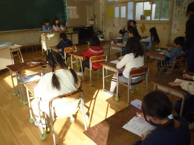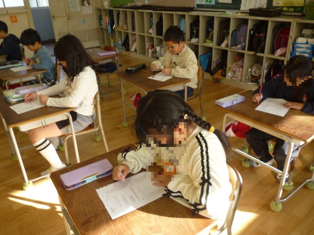 算数プリント学習です。学習かかりさんが、プリントの答え合わせをしています。