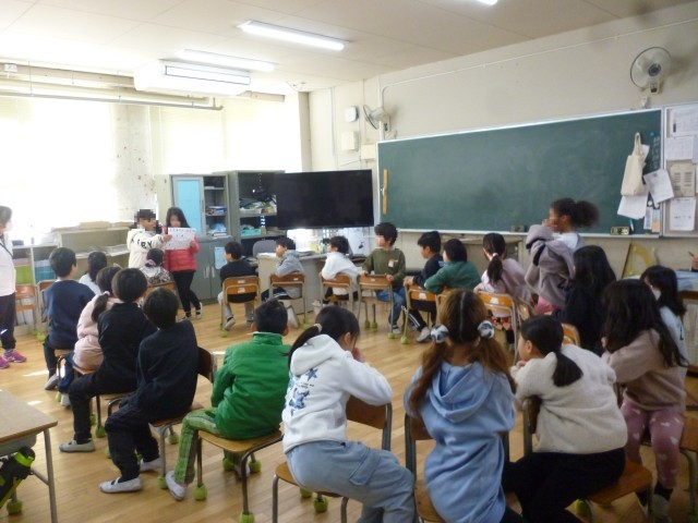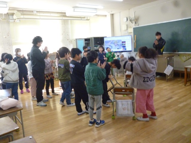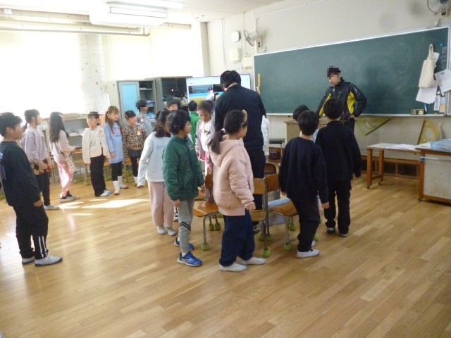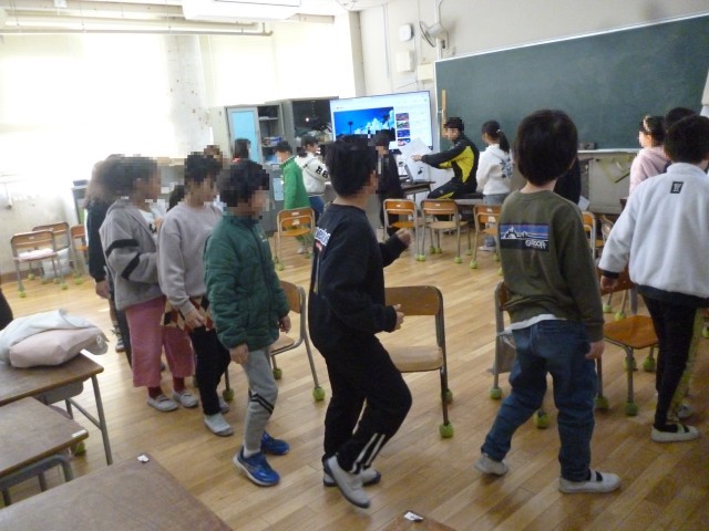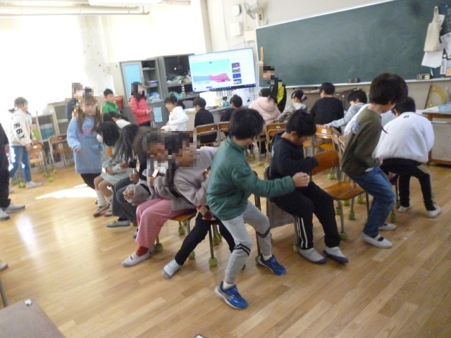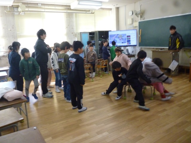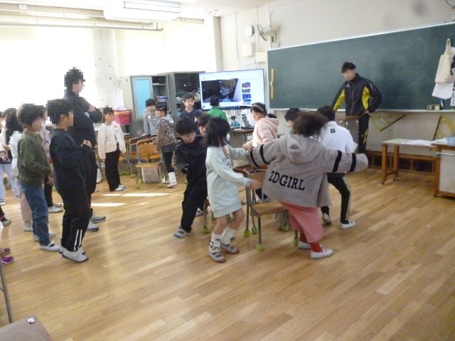 みんなで楽しくいすとりゲームです。かかりのせつめいの後、ゲームスタートです。みんななかよく活動できました。