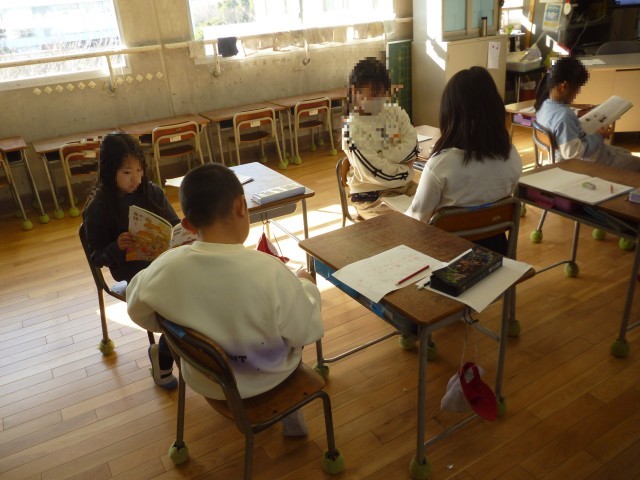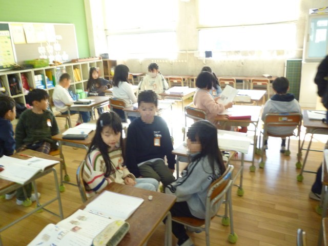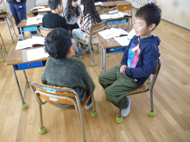 せつめい文について考えています。できるだけ多くのいけんが出て、話し、聞く力をつけるために、ペアや小グループでの対話の時間を大切にしています。