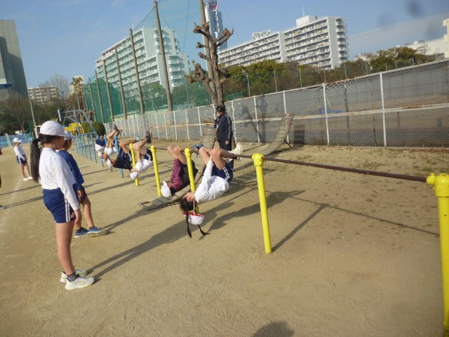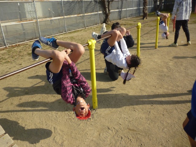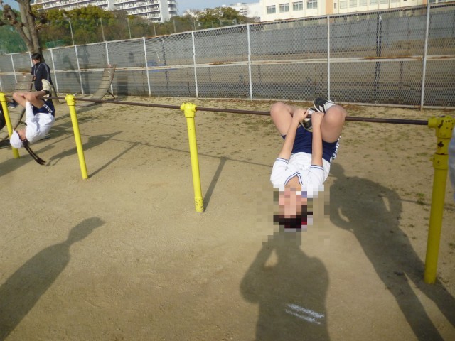 両手を交差させて両足を鉄ぼうにかけます。そして、そのまま回転します。