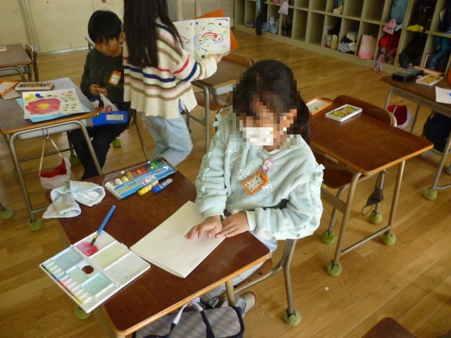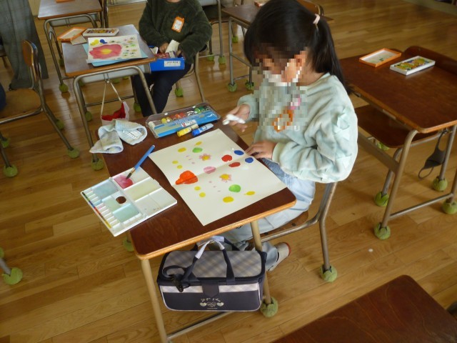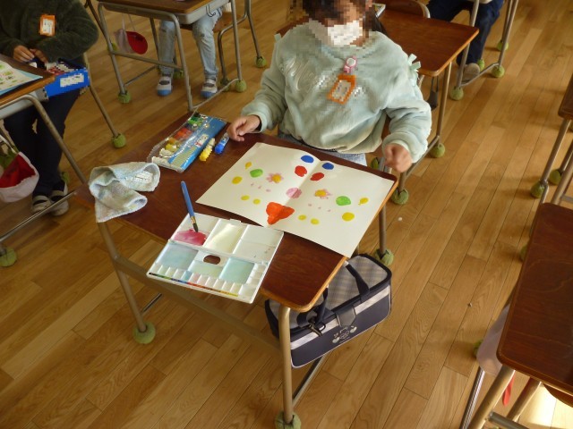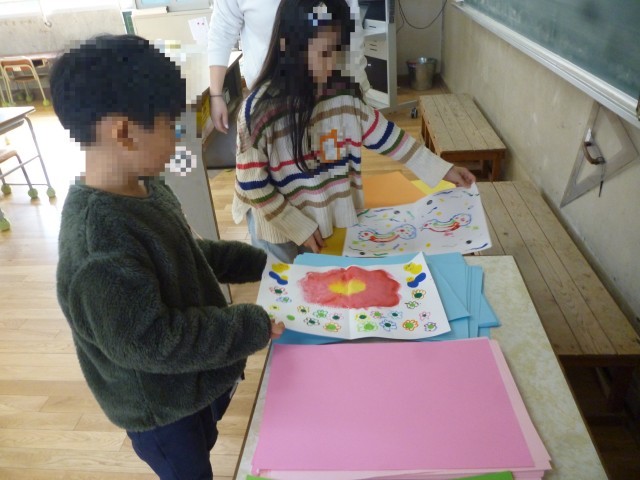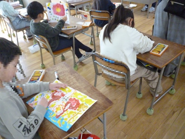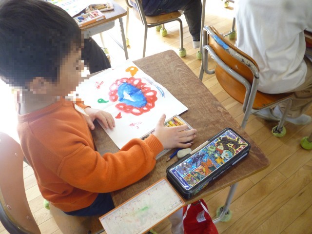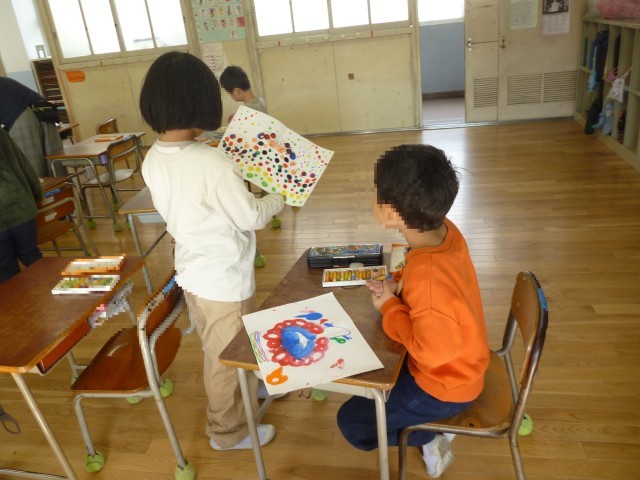えのぐをがようしにつけ、ぱったんします。できあがったもようにクレバスでかいていきます。子どもたちのゆたかなはっそうで、こせいゆたかな作品ができました。