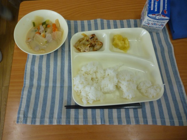 今日のこんだては、鶏肉の塩こうじ焼き・かす汁・くりきんとんです。かす汁は寒くなってきたのもあって、子どもたちに好評でした。くりきんとんは、ほどよいあまさで、たいへんおいしかったです。