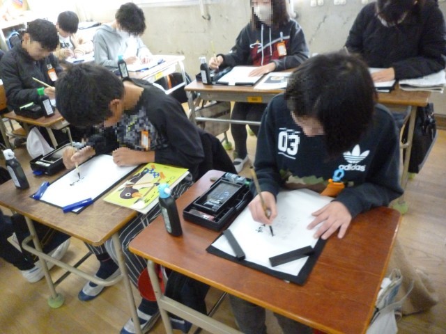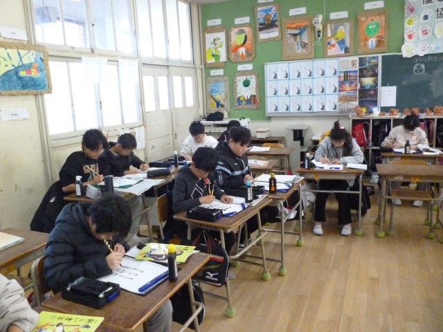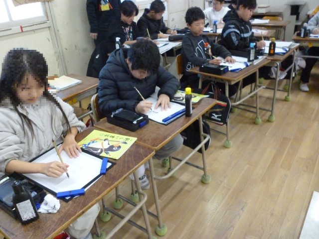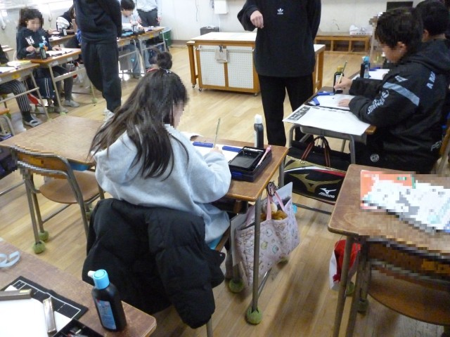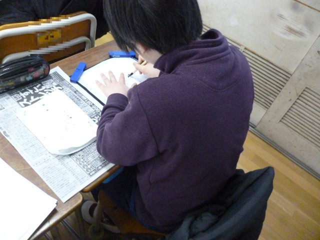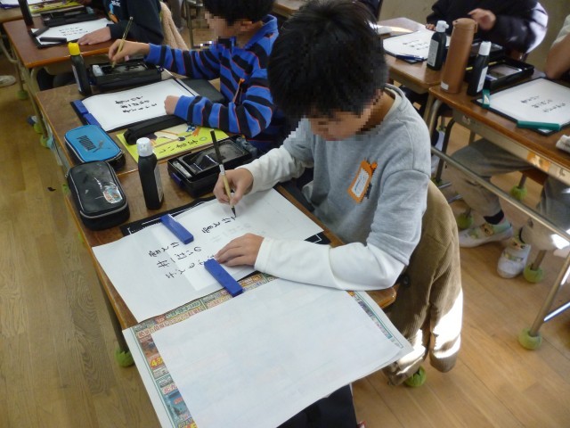 今日は小筆で書きます。みんな「とめ」「はらい」などに気をつけ、集中して書いています。