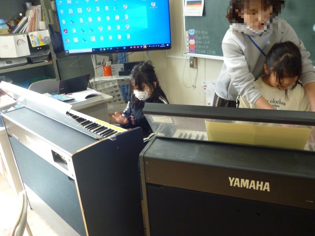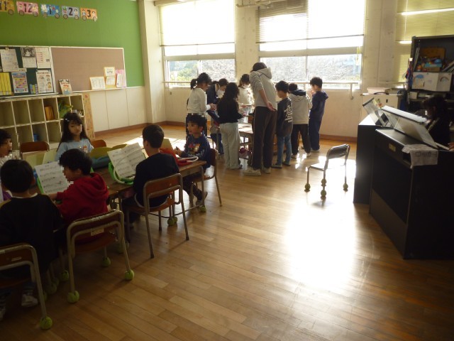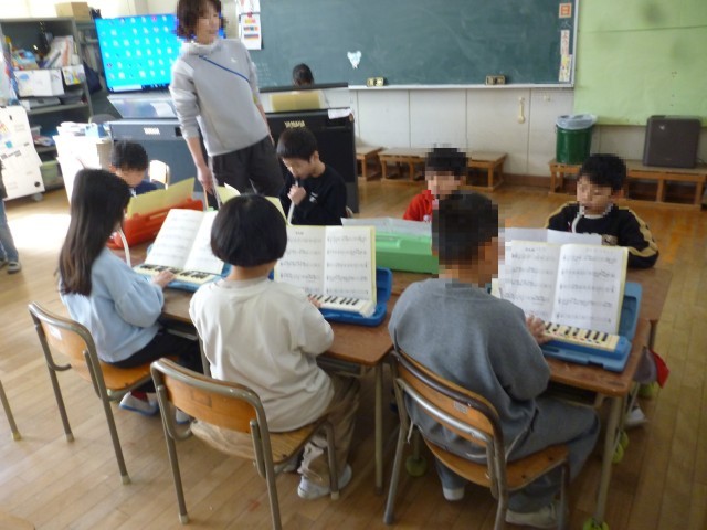 今日は、1・2年生いっしょに音楽の学習です。卒業を祝う会や入学式では、1・2年生がいっしょにお祝いの歌やえんそうをします。けんばんハーモニカのれんしゅうでは、2年生が1年生にやさしく教えています。