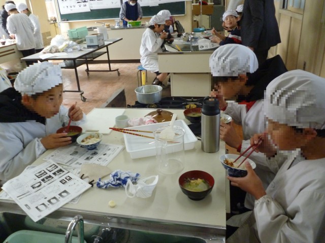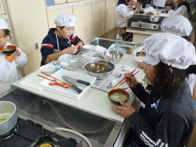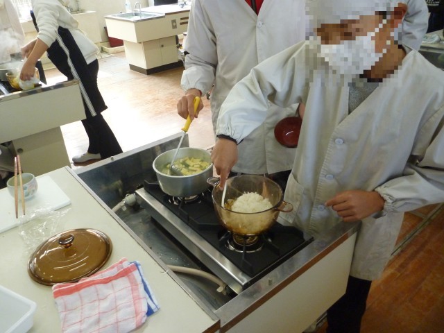 今日は、5年生が調理実習でごはんとみそ汁を作りました。これまでの調理実習や林間学習でのはんごうすいさんなどで、少し調理にも慣れているようです。班で力を合わせて、てきぱきと作っています。ねぎ、だいこん、うすあげの入った具がいっぱいのみそ汁。おこげのあるおいしそうなごはん。みんな、たいへんおいしくいただきました。
