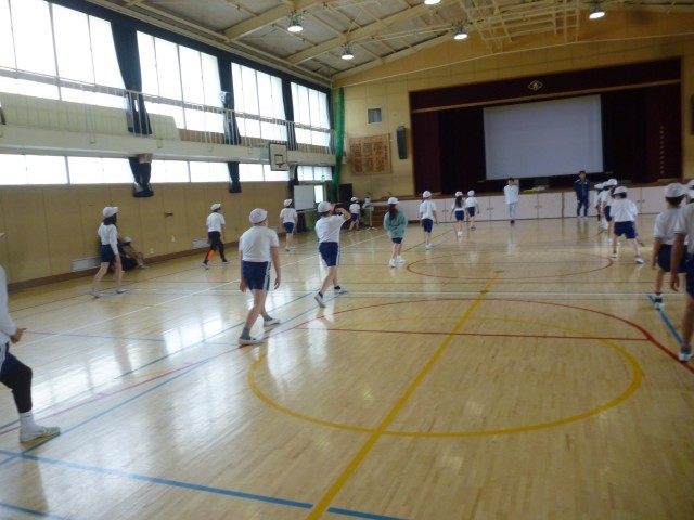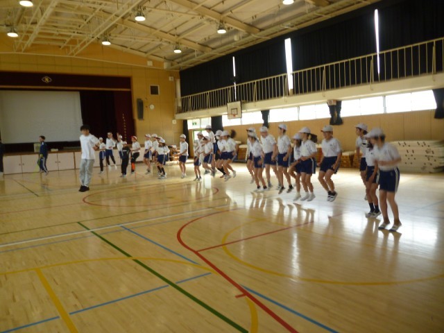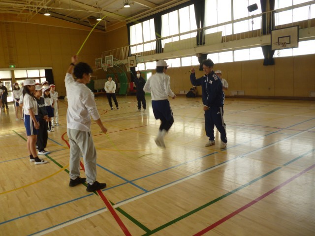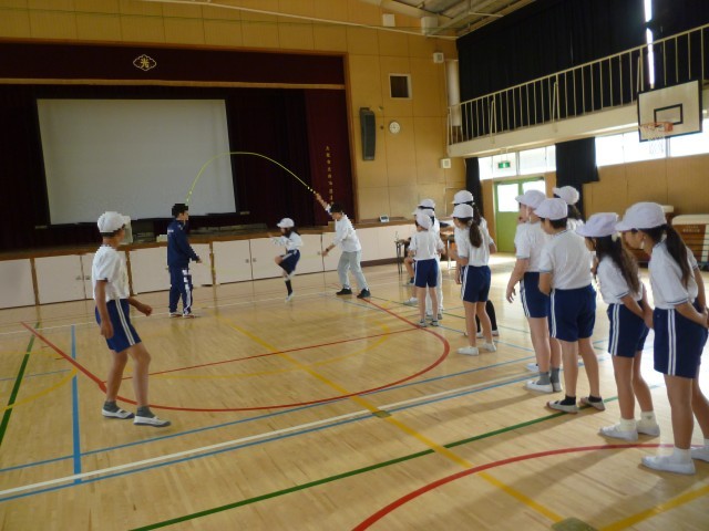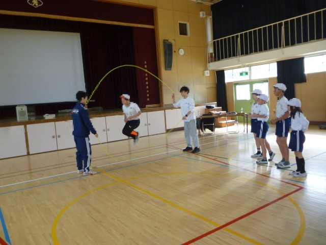 今日は、講師の先生をお招きしての「夢・授業」です。5年生がダブルダッチに挑戦しました。まずは、講師の先生のお話です。「夢」について、子どもたちに話していただきました。「夢」は追いかけ続ければかなうというお話に、子どもたちは感銘を受けたようでした。講演のあと、実際にダブルダッチをしました。準備運動の後、中に入って跳ぶ練習です。子どもたちは、夢中になって跳んでいます。