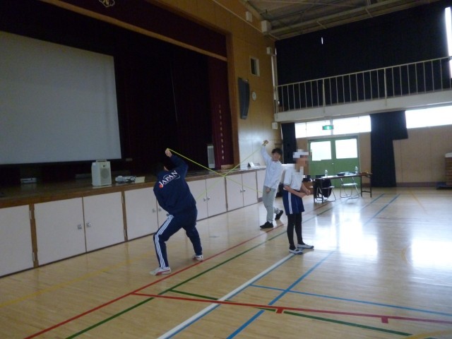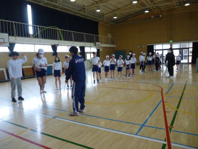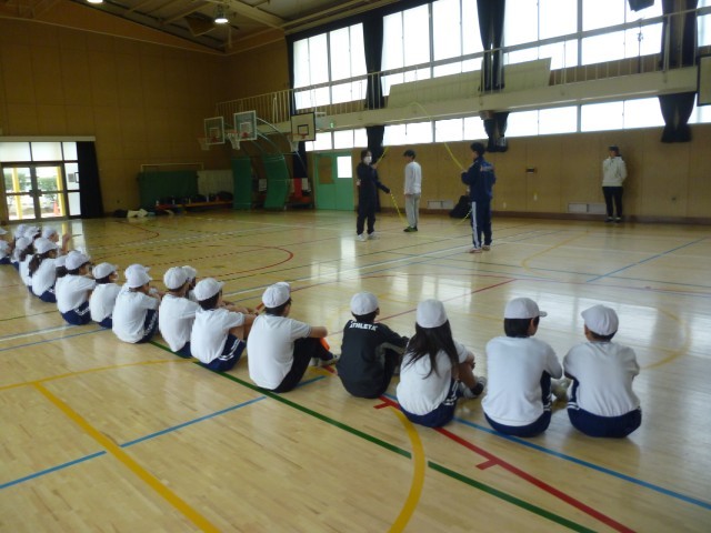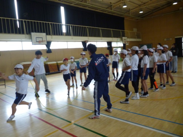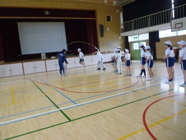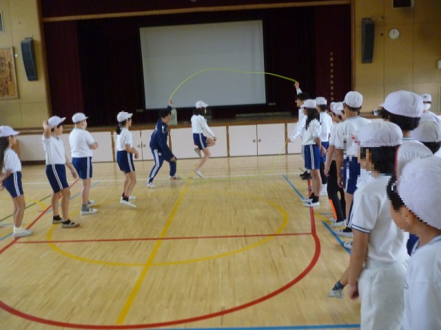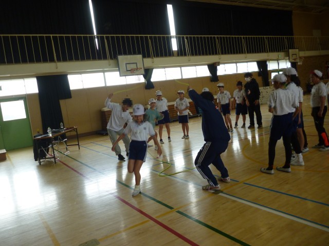 つぎに、少し難しい跳び方です。リズムよくなわを跳び、そのまま抜けていきます。跳んでいくうちに、リズムよく跳べるようになってきました。子どもたちは夢中になって跳んでいます。体験の最後に代表児童が、難しい跳び方をして、きめのポーズ。子どもたちにとって、貴重な体験となりました。「Fat me crew」の皆様、ありがとうございました。