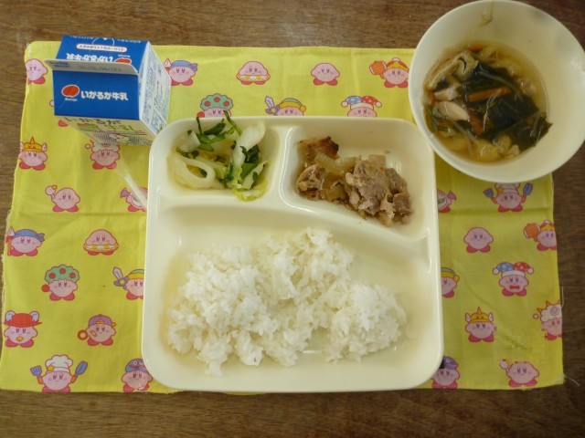 今日のこんだては、ぶたにくのスタミナ焼き・五目汁・きくなとはくさいのおひたしです。ぶたにくのスタミナ焼きは、ごはんとあっていてたいへんおいしかったです。