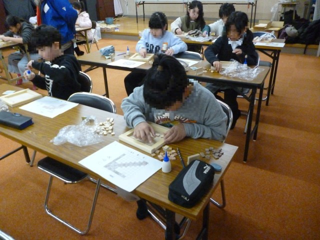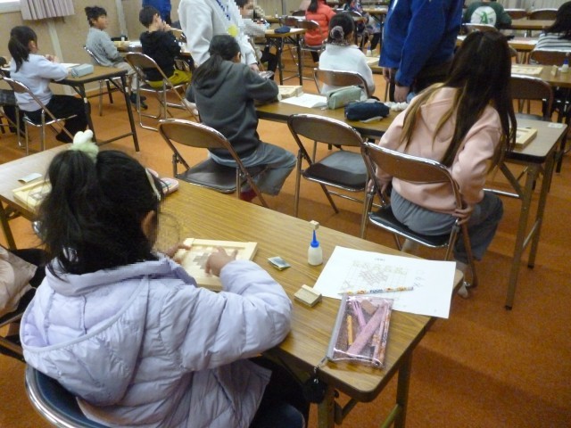 チップをしきつめていきます。一つ一つていねいにしきつめていきます。できあがった作品を見てみんな大満足でした。