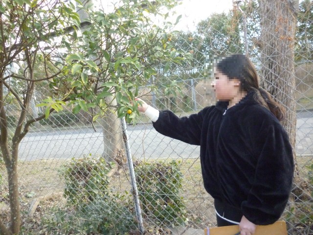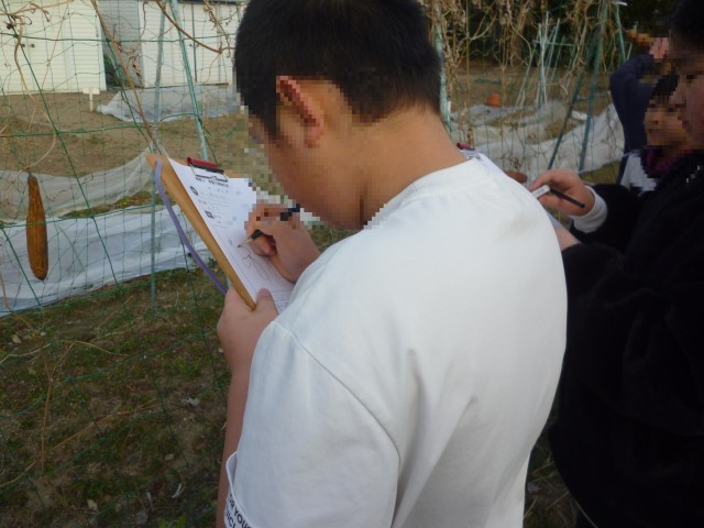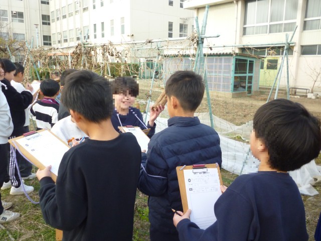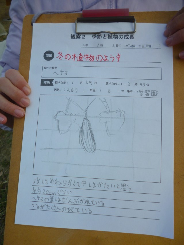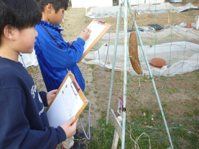 ヘチマの観察です。よく見てかいています。学習園のキンカンの実もなっていました。いいにおいがしました。