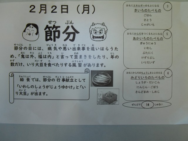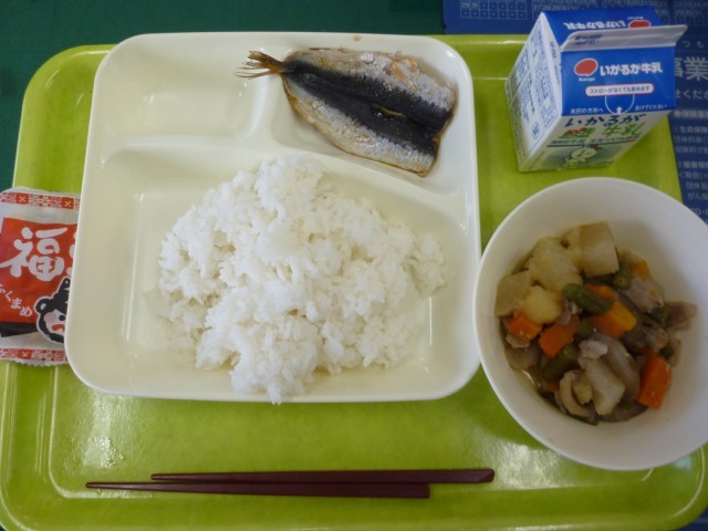今日のこんだては、いわしのしょうがじょうゆかけ・ふくめ煮・いり大豆です。節分の行事こんだてです。いわしのしょうがじょうゆかけは、しょうがじょうゆで、子どもにもたいへん食べやすくなっています。