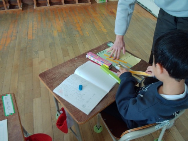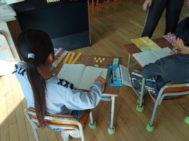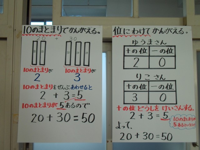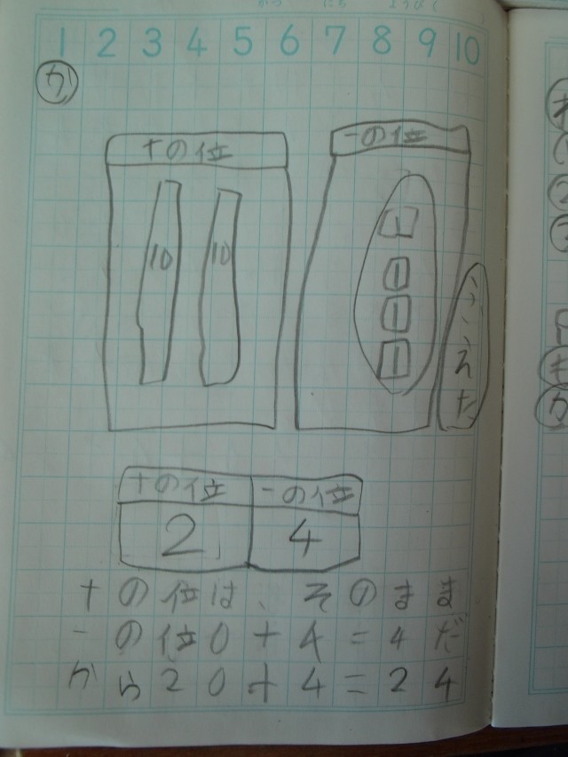 これまでは、「20+30」のけいさんのしかたを学習してきました。今日は、「20+4」のけいさんのしかたをかんがえています。ノートにずをかいたり、ブロックをつかったり、いろいろなほうほうでかんがえています。