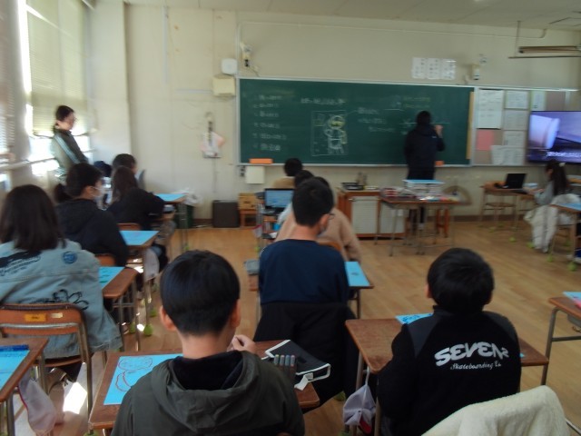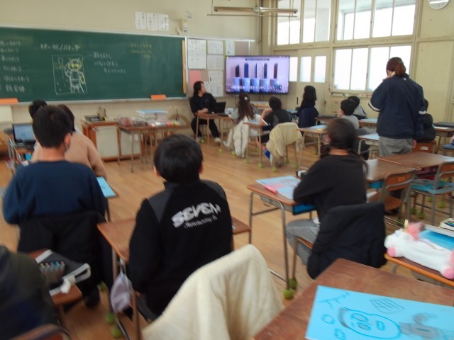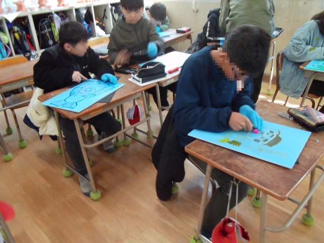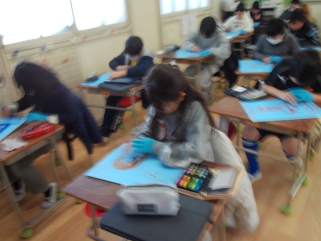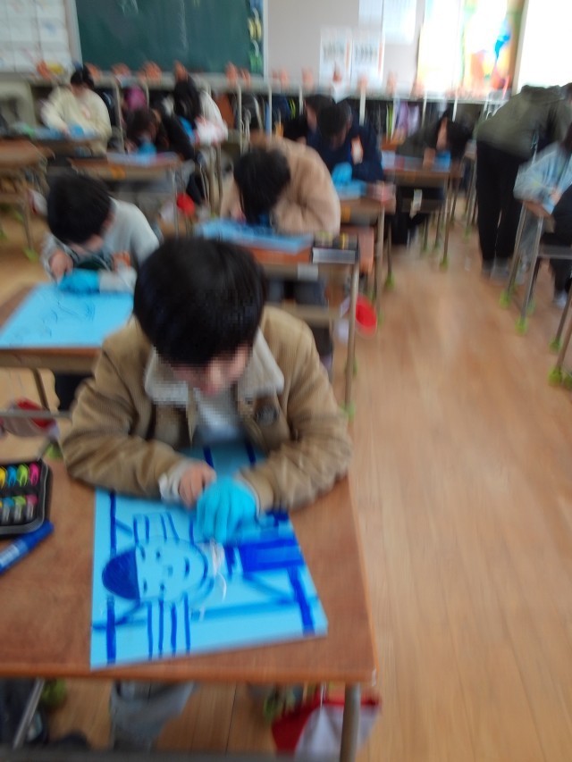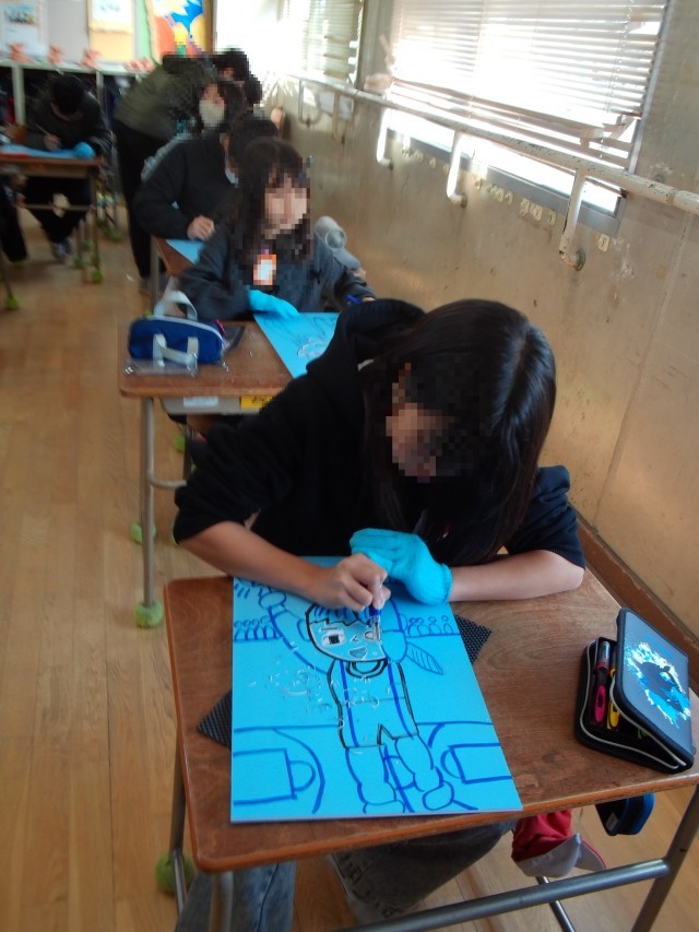 木版画です。まずは、顔やりんかくを工夫して彫るように、彫刻刀の使い方を復習しました。そして、安全に気をつけて、彫り進めています。