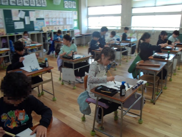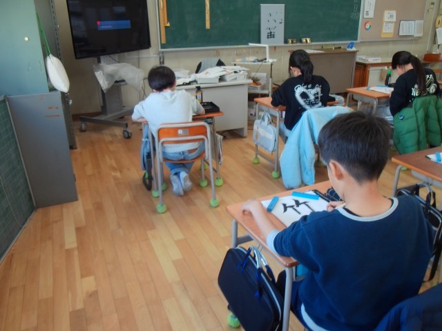 「竹」の字の左右のバランスを考えて書いています。また、二つの文字のバランスも考えて書いています。集中しています。