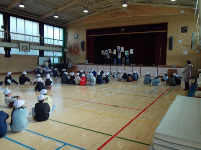 今日の集会は、言葉のならびかえゲームです。集会委員会の子どもたちが、舞台でもっているカードをならびかえてできる言葉を、グループで考えています。最後は少し長い言葉でしたが、みんなわかったようです。