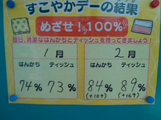2月の結果です。1月より向上しています。まだまだ、風邪・インフルエンザが流行っています。手洗い等の励行を、結果を振り返りながら、子どもたちに意識させていきます。