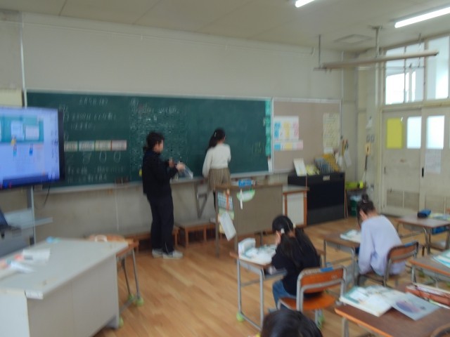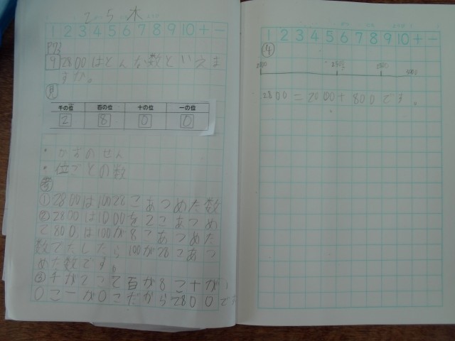 大きい数の学習です。前回、千の大きさをみんなで図に表しました。今日は、それをふまえて、「2800」という数を、いろいろな見方で考えています。