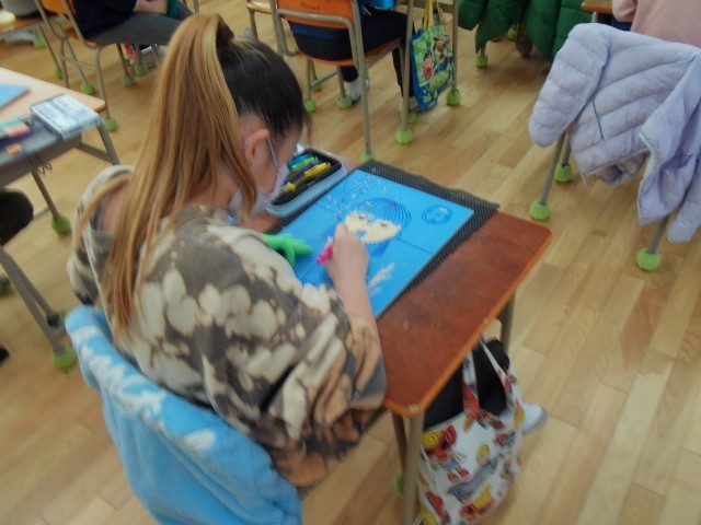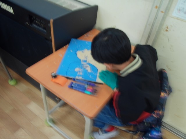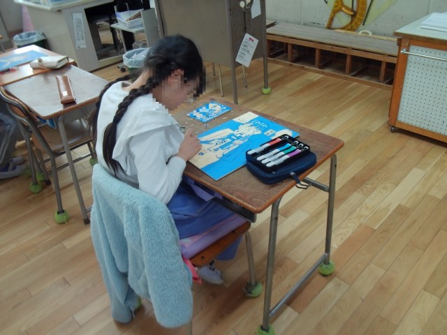 木版画です。題材は、「リコーダーをふくわたし」です。彫るところによって、方向や彫り方をかえています。