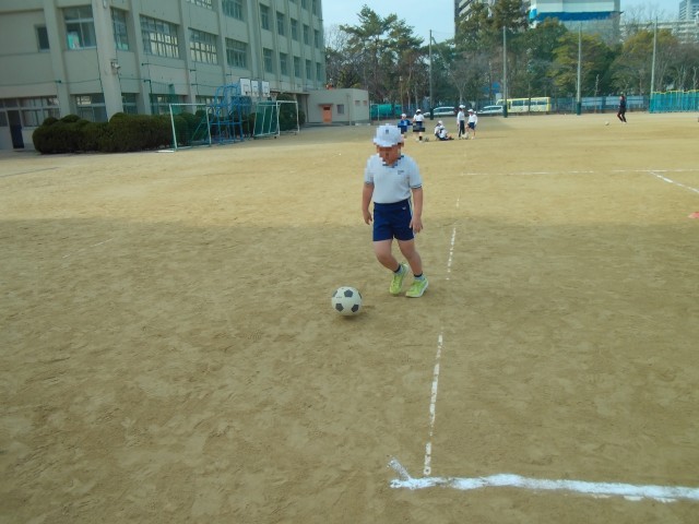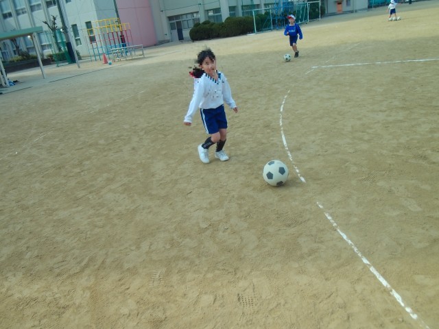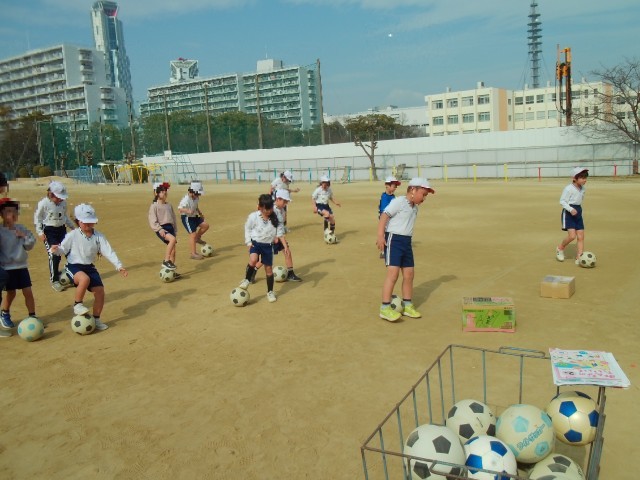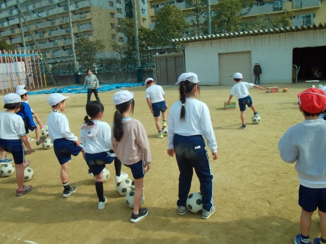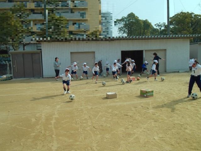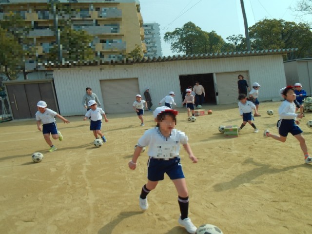 ボールけりあそびです。ボールになれるようにうんどうじょうのトラックをボールをけってまわっています。つぎに、ボールをけりながら、「だるまさんがころんだ」をしました。足でボールをけるのになれてきたようです。