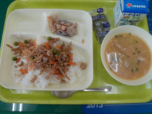 今日のこんだては、とりごぼう飯・みそ汁・焼きれんこんです。とりごぼう飯は、具とごはん、きざみのりをまぜあわせて食べると、たいへんおいしかったです。