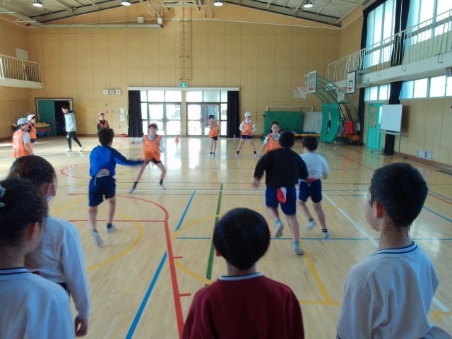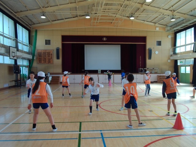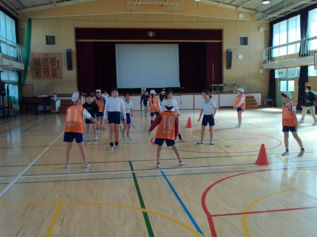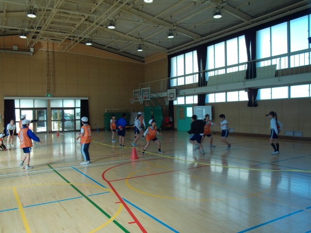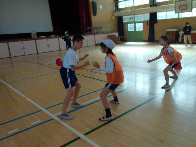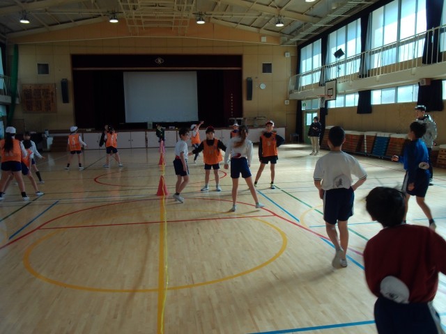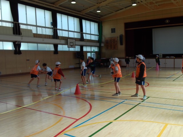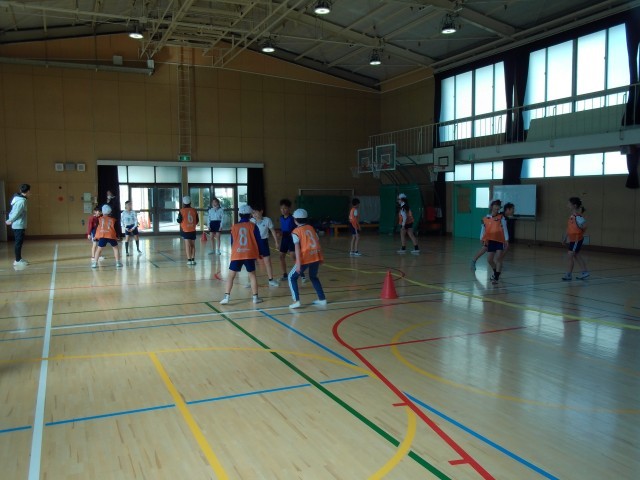 2チームに分かれゲームです。腰につけたぼうしをとられないように、相手のチームのディフェンスを交わしていきます。二人で同時に行ったり、前後に行ったり、いろいろと作戦を考えています。子どもたちは、夢中になって活動しています。