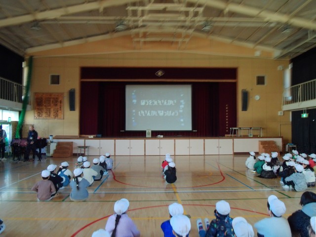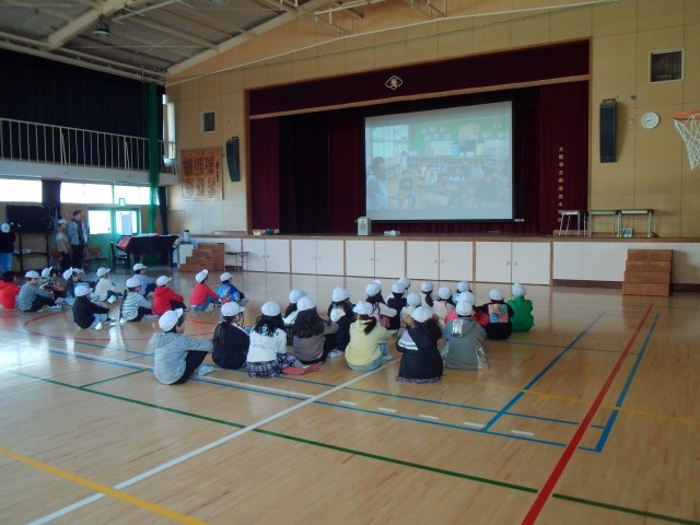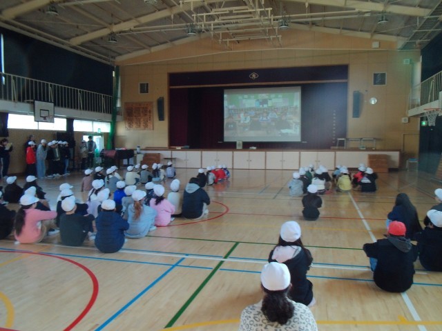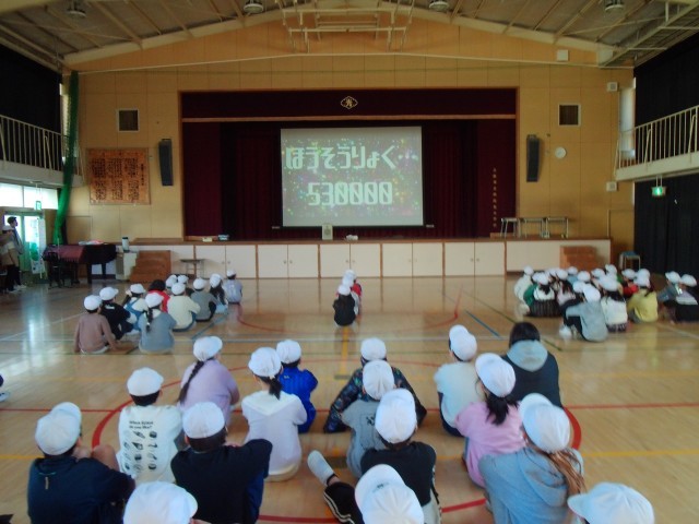 今日の集会は、委員会活動の発表です。放送委員会です。放送力を高めるためにがんばっていることを、ドラマ仕立てで発表です。みんなが笑顔になる楽しい発表でした。