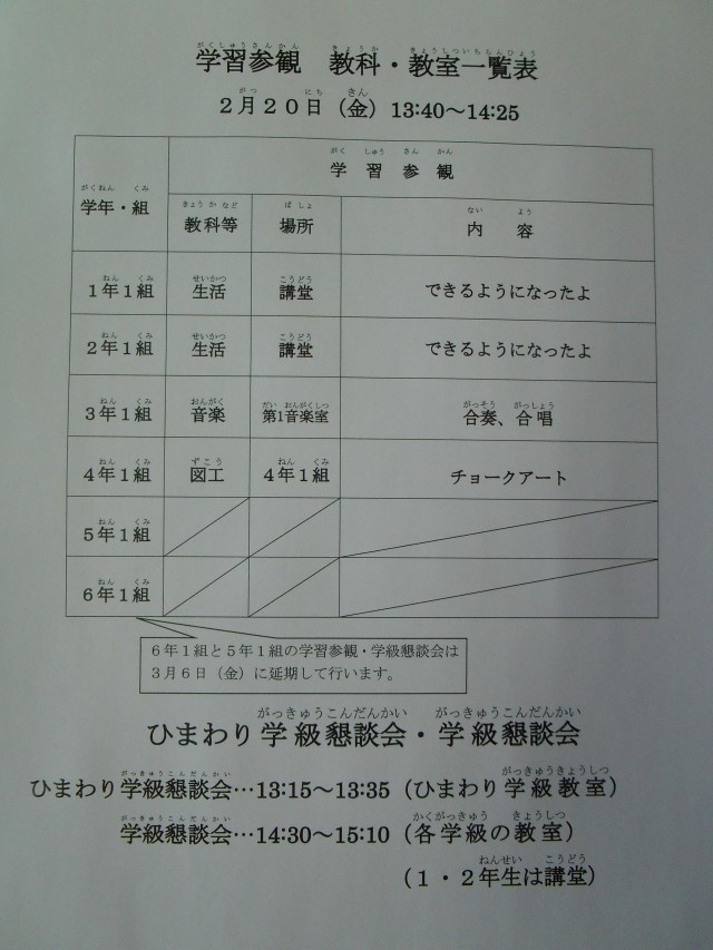本年度最終の学習参観・懇談会です。子どもたちのがんばりを、ぜひご参観ください。なお、5・6年生は3月6日(金)に変更しています。