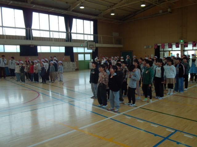 今日の集会は、卒業を祝う会に向けての歌集会です。1年生から5年生までの在校生が、みんなで歌の練習をしました。