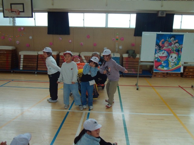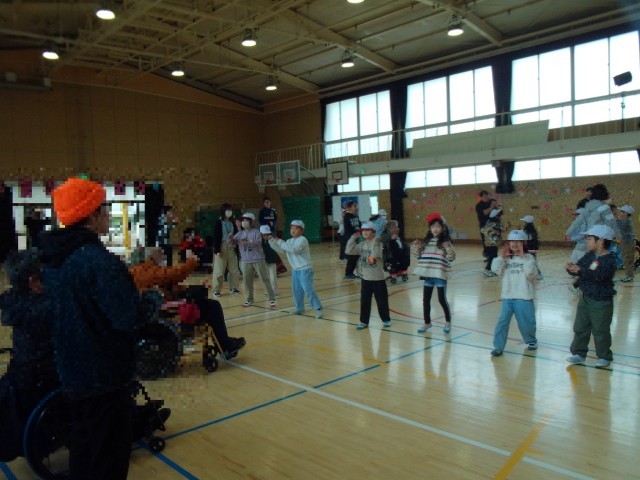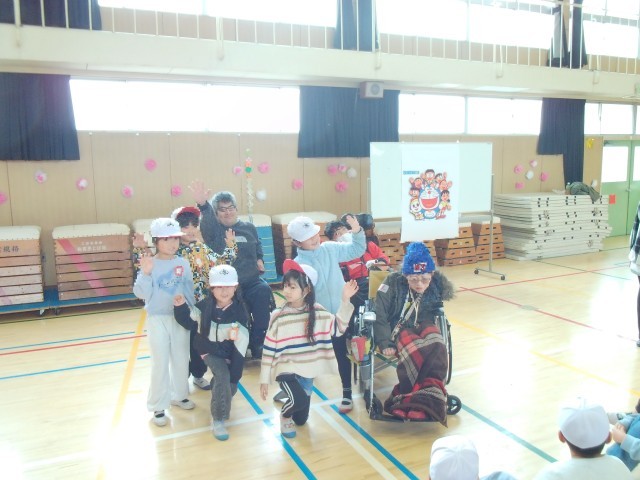 1・2年生が、夢宙センターの方々と交流しました。3時間目は、運動会でおどったダンスをいっしょにしました。1・2年生はよく覚えていて、いっしょに楽しむことができました。つぎに、ポスターと同じポーズをし、記念撮影をしました。