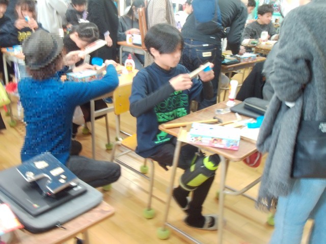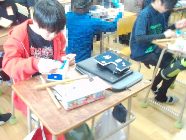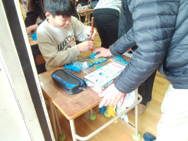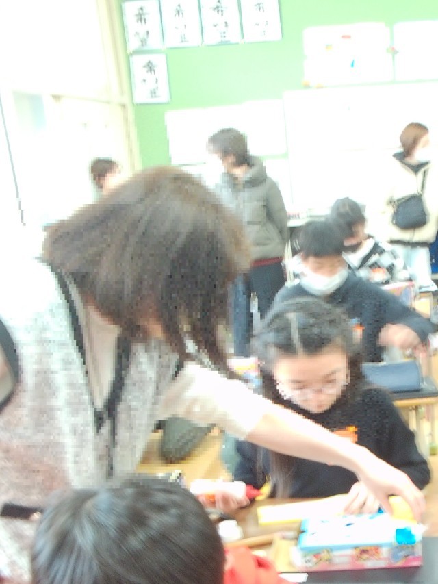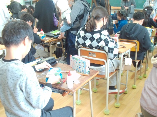 同じく延期になっていた6年生の学習参観です。教科は図工です。テープカッターを作っています。保護者の方々にも手伝っていただきながら作っています。