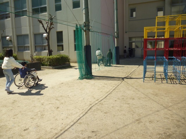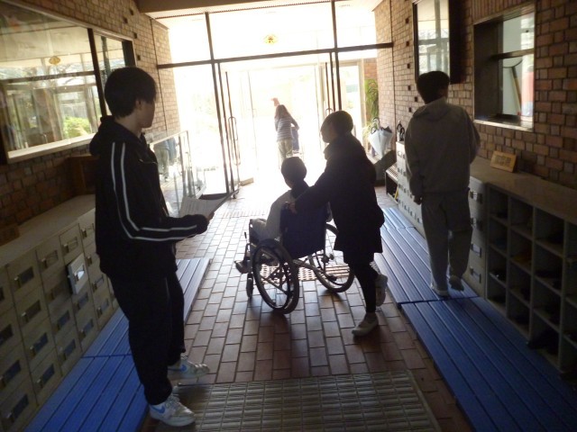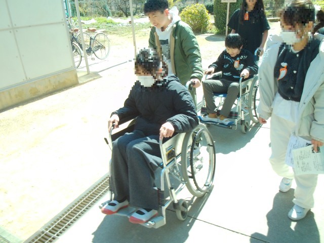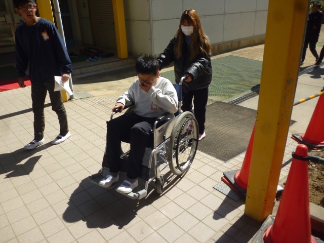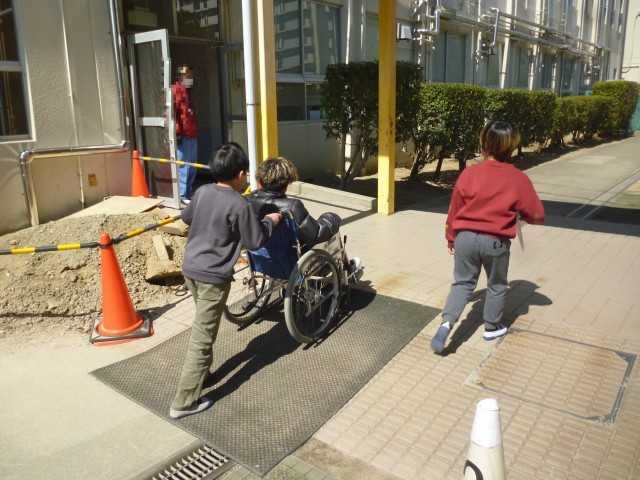 次に、介助体験です。車いすをおして、校内をまわっていきます。校内にも段差があったり、車いすがぎりぎりで通ることができる場所があったりします。反面、スロープなど配慮がされているところがたくさんあることにも、あらためて気づいたようです。今回の車いす体験は、子どもたちにとって貴重な体験となりました。リハビリテーションセンターのスタッフのみなさん、子どもたちのためにご指導ありがとうございました。