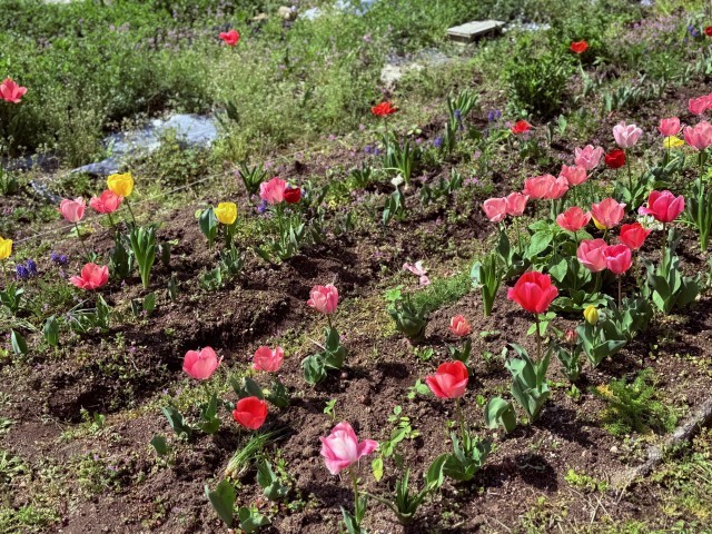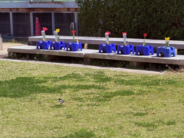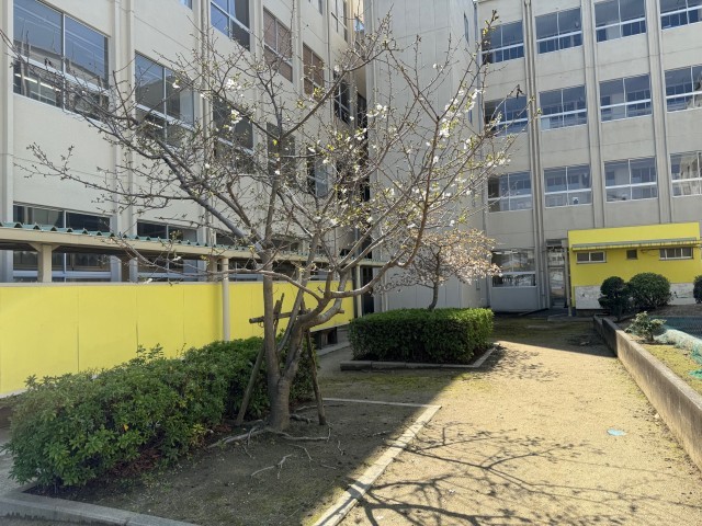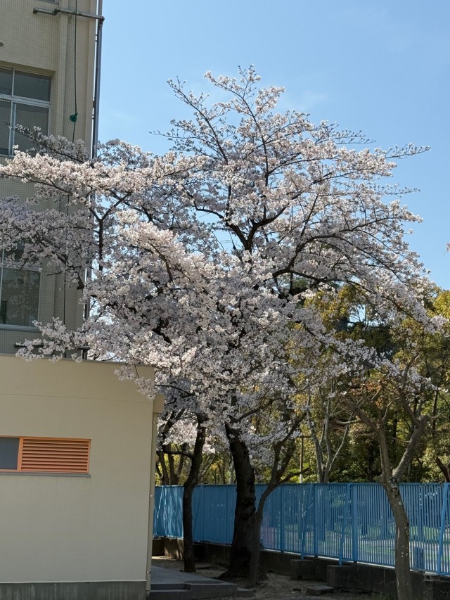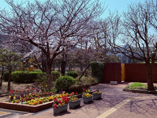 南港光小学校の桜は、満開のものもありますが、玄関の桜はこれからです。2年生が育てているチューリップは、きれいな花を咲かしています。