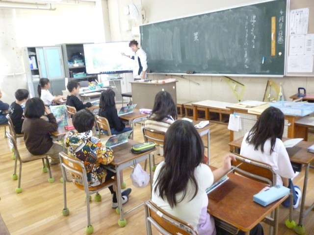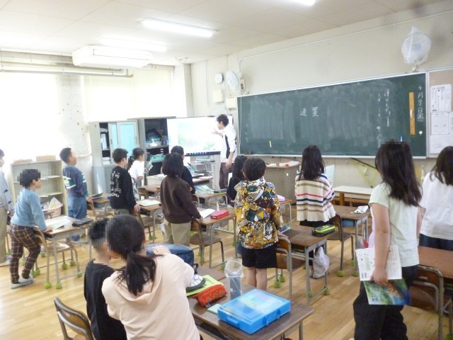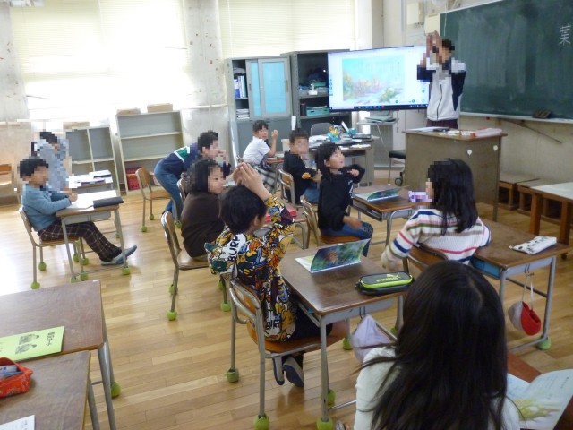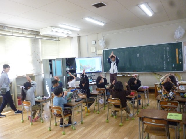 詩の学習です。ふきのとうがのびるようすを、体をつかって表現しています。「ぴくぴく」「ぴくくくっ」という表現のちがいを感じています。