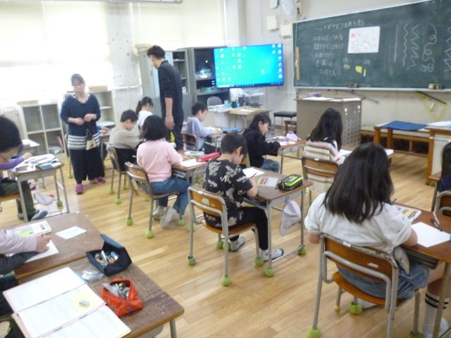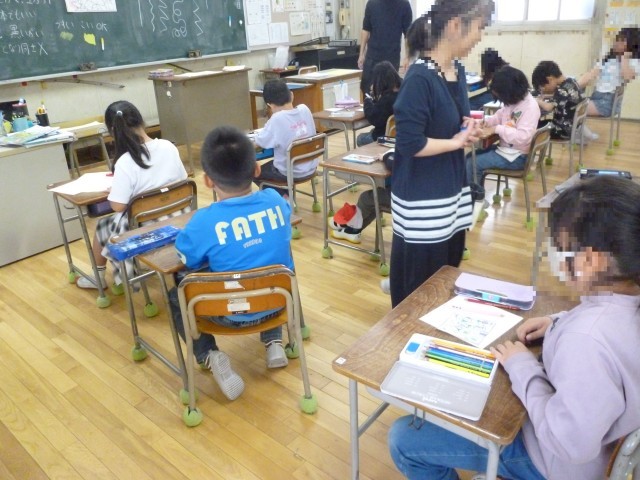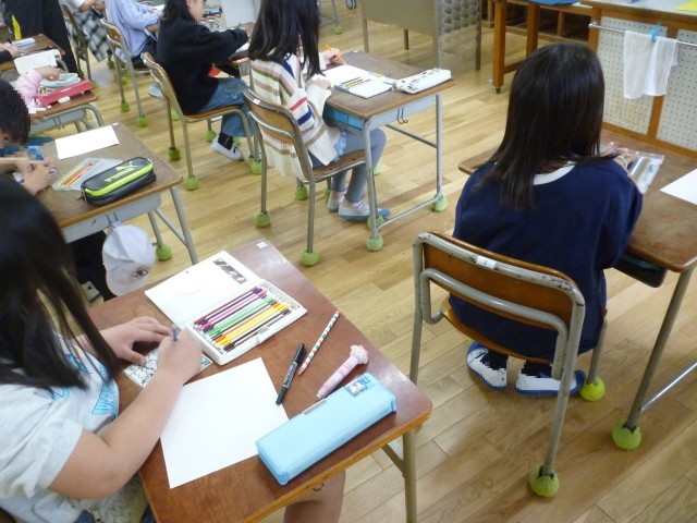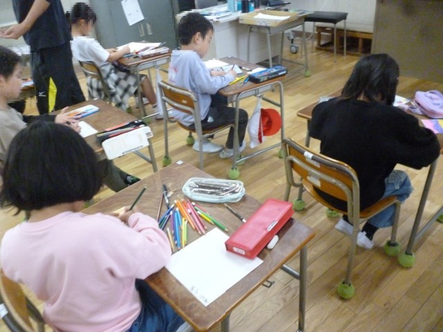 できた形に色えんぴつで色をぬっています。できた形と色のくふうで、楽しい作品になります。